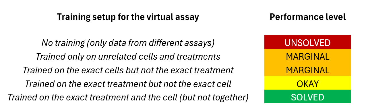 When we looked at which experiments could be simulated most reliably, one pattern stood out: success didn’t depend on the type of perturbation (drug, CRISPR, RNAi) or on the specific endpoint (viability, transcriptomics, phenotype). It depended almost entirely on the nature of existing data from that assay. Like this: