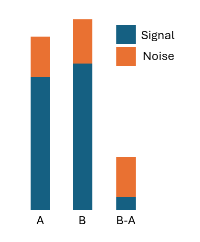 Combination synergy metrics, like Bliss, are famous for being noisy. It is because they are fundamentally difference metrics of the effectiveness of the drugs administered individually vs in combinations. A difference – especially if the two arguments are close – amplifies noise, sometimes extremely so. The figure below should give an intuition why that happens.