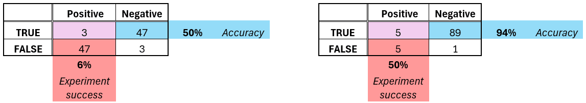 I mean half of the signal will still be there. Interesting signals are rare. If you have 50% (coin-flip) accuracy, and 5% interesting signal, most likely all of your top 10 experiments will fail. You need more than 90% accuracy on the average data point to keep half your signal in the wet-lab. Here’s an illustrative example below (with 6% signal to keep numbers nice).